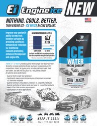 Engine Ice - Ice Water is a coolant concentrate that provides a reduction in surface tension on aluminum surfaces and moves heat away from the engine faster than water. When mixed with deionized or distilled water, it protects engine parts, including iron, brass, aluminum, steel and rubber. Ice Water is easy to use. Mix the contents of this 12oz pouch with 3-5 gallons of distilled water to create a finished product that offers maximum cooling performance.