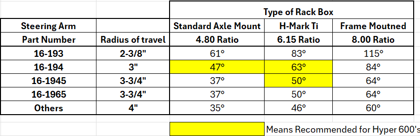 Here is a chart showing the different ratio racks, the different length steering arms, and the corresponding degrees of front tire turning you will get with 1/2 turn of steering wheel input. More degrees of movement equal a quicker turning ratio
